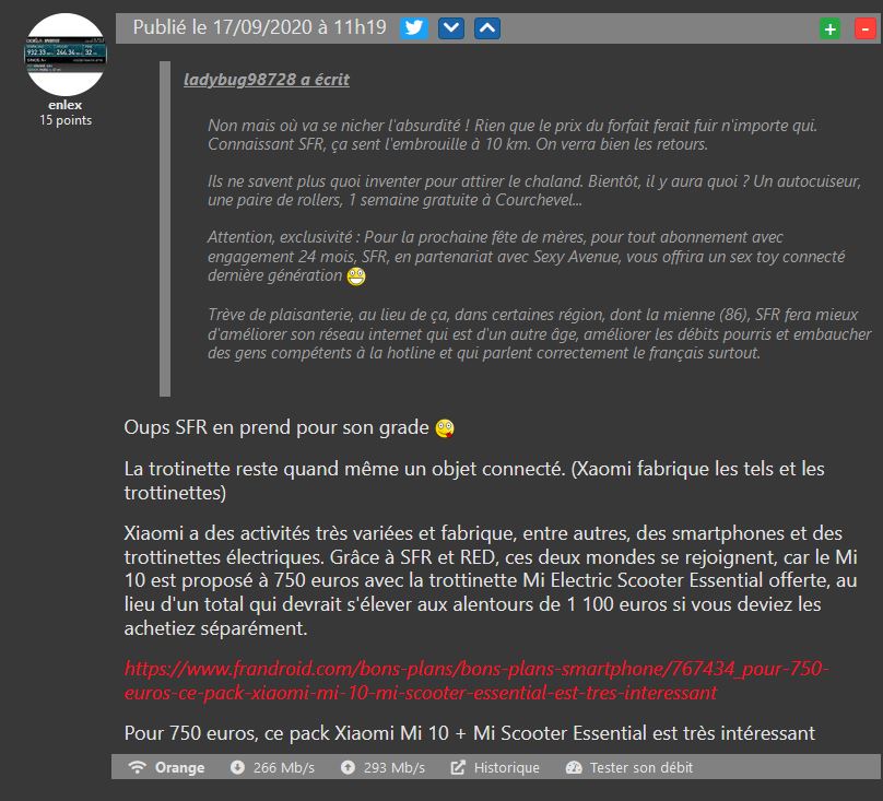 SFR nous a surpris en proposant, pour l’achat d’un smartphone, une trottinette électrique offerte ! Le lien entre les télécoms et les moyens de locomotions devient certes très ténu avec les voitures autonomes, mais l’association a de quoi faire sourire et nos lecteurs n’hésitent pas à taquiner les opérateurs concurrents et leurs offres… inédites ?