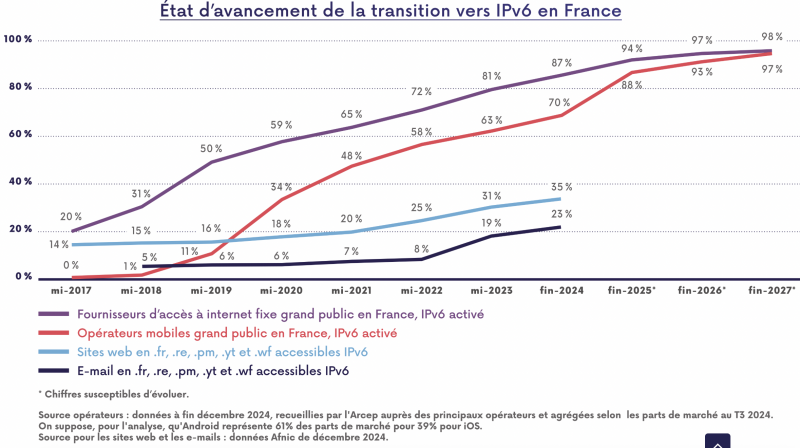 La courbe de progression est toutefois importante chez les opérateurs. Depuis 2017, la part des accès fixes en IPv6 est passée de 20 % à 87 % fin 2024, et les projections estiment une quasi-généralisation à 98 % dès fin 2027. Côté mobile, l’évolution est encore plus spectaculaire : de 0 % en 2017 à 70 % fin 2024, pour atteindre 97 % en 2027. Ces chiffres traduisent un effort considérable de la part des opérateurs télécoms, dont Free qui s’est enfin mis à la page en mars 2025.