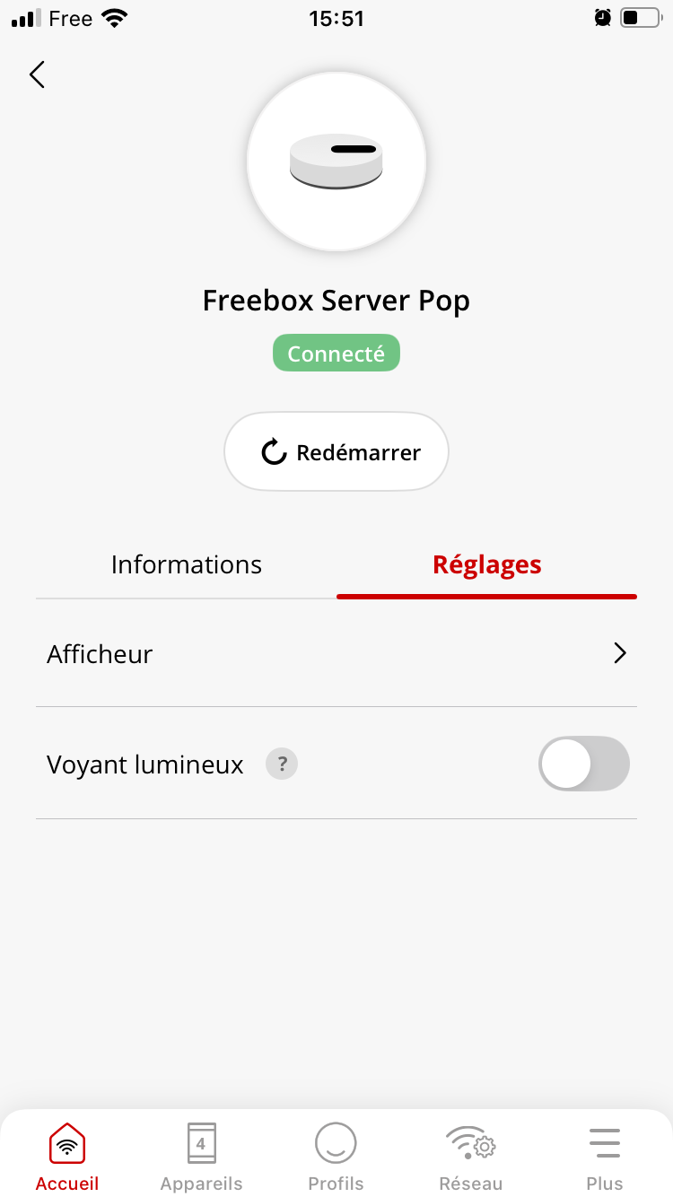 Autre ajout pratique : la possibilité d’activer ou de désactiver la LED du Server directement depuis l’app. Une fonctionnalité accessible exclusivement aux abonnés Freebox Pop et Ultra, qui permet de gérer l’affichage lumineux sans passer par Freebox OS. Pour ce faire, il suffit de se rendre dans les réglages après avoir cliqué sur serveur, et de désactiver le “voyant lumineux”.