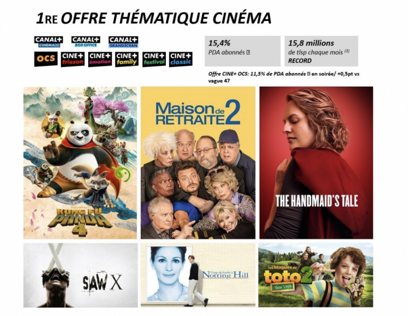 Sur la thématique cinéma, Canal+ annonce 15,4 % de part d’audience abonnés et 15,8 millions de téléspectateurs chaque mois. L’association Ciné+/OCS totalise 11,5 % de part d’audience en soirée, en progression de 0,5 point par rapport à la précédente vague Médiamat’Thématik. Ces résultats valident la stratégie « grand écran » du groupe, fondée sur les avant-premières exclusives et un catalogue constamment renouvelé. La Polar+ étonne également avec 3,8 millions de téléspectateurs par mois et un rang de 1ère chaîne thématique sur les femmes abonnées avec 6,6% de PDA.