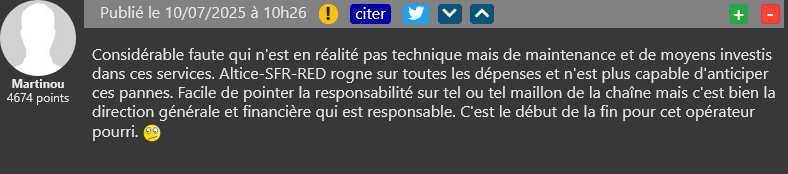 Le 16 juin 2025 restera dans les mémoires des abonnés SFR comme une journée de galère numérique. En fin de matinée, une panne massive a paralysé les services de l’opérateur sur l’ensemble du territoire, affectant les connexions mobiles, appels impossibles, SMS bloqués, navigation internet hors-service. Si la cause exacte est restée floue, Le Monde a pu en dévoiler les ressorts le 7 juillet grâce à des échanges internes entre la direction de SFR et ses salariés auxquels il a eu accès. Selon ses révélations, la panne trouve son origine dans le déploiement d’un correctif de sécurité sur les routeurs professionnels de l’opérateur. Cette mise à jour considérée comme routinière avait pour but de combler une faille technique, elle a été appliquée en pleine matinée, mais moins d’une heure après le lancement de l’opération, près d’une centaine de routeurs sont tombés en panne simultanément, affectant quelque 20 000 clients entreprises. Ce dysfonctionnement a entraîné une saturation des deux points de présence principaux du cœur de réseau mobile de SFR, éléments névralgiques chargés de faire transiter le trafic entre les antennes et Internet. Résultat, c’est l’ensemble du réseau mobile qui a été paralysé. Une explication qui n’a clairement pas joué en faveur de SFR…