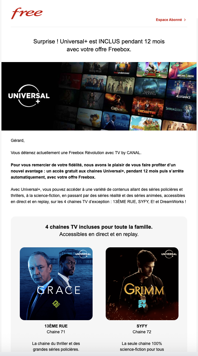 Dans ce mail, l’opérateur annonce : “Pour vous remercier de votre fidélité, nous avons le plaisir de vous faire profiter d’un nouvel avantage : un accès gratuit aux chaînes Universal+, pendant 12 mois puis s’arrête automatiquement, avec votre offre Freebox.”