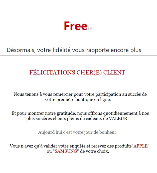 Encore un piège tendu aux abonnés Free Mobile. Dans un e-mail intitulé “Félicitation, Votre cadeau est prêt !”, l’escroc promet une journée de bonheur en récompense de leur fidélité. Concrètement, c’est la promesse d’un smartphone Apple ou Samsung. Il suffit de valider une enquête.