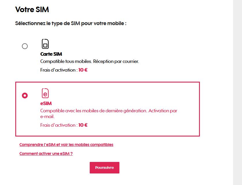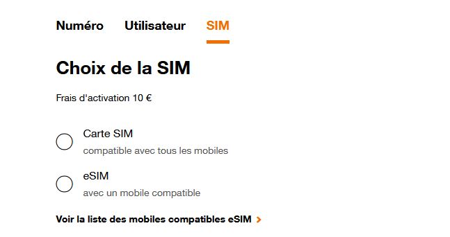Sur le site web de la marque low-cost d’Orange, il est indiqué dorénavant que vous avez le choix entre la carte SIM normale et la version virtuelle. Lors de la souscription à votre nouveau forfait, après avoir entré vos nouvelles coordonnées, vous pouvez opter pour cette technologie.