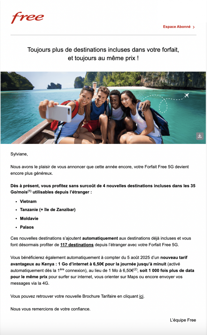 Mais pas seulement, Free Mobile en profite pour annoncer une autre nouveauté : “Vous bénéficierez également automatiquement à compter du 5 août 2025 d’un nouveau tarif avantageux au Kenya : 1 Go d’internet à 6,50€ pour la journée jusqu’à minuit, activé automatiquement dès la 1ère connexion) au lieu de 1 Mo à 6,50€”, indique le courriel. Une bonne nouvelle pour les abonnés concernés car cela représente 1 000 fois plus de data pour le même prix pour surfer sur internet, utiliser Google Maps ou encore envoyer vos messages via la 4G.
