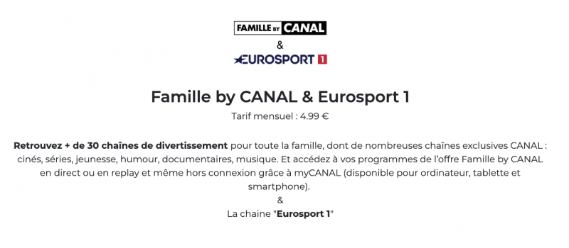 Une manière de commercialiser Eurosport 1 auprès de ses abonnés Freebox sans TV by Canal. Sur son site internet et dans la liste actualisée des chaînes en juillet, l’opérateur a discrètement dévoilé un nouveau bouquet baptisé « Famille by CANAL & Eurosport 1 », proposé au prix de 4,99€/mois, soit le tarif actuel de Famille by Canal seul.