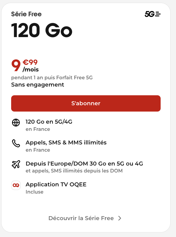Désormais proposé à 9,99€/mois pendant un an (contre 8,99€ précédemment), ce forfait inclut toujours 120 Go de data en France métropolitaine en 5G. En revanche, le volume de données utilisables en Europe et dans les DOM passe de 35 Go à 30 Go. Les appels et SMS restent illimités depuis ces zones, et l’accès à l’application TV Oqee by Free est toujours inclus.