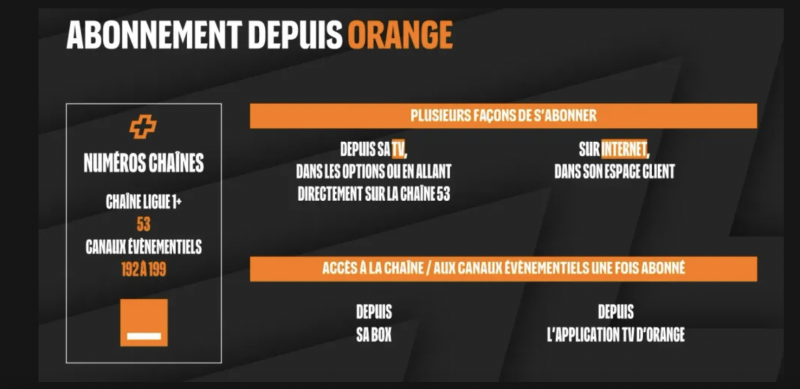 Chez Orange, Ligue 1+ est disponible sur le canal 53, avec les canaux événementiels répartis entre les positions 192 et 199. L’abonnement peut être activé directement depuis l’interface TV, dans les options ou en accédant à la chaîne 53, ou depuis l’espace client en ligne. Une fois abonné, l’accès est possible via la box TV et l’application TV d’Orange.