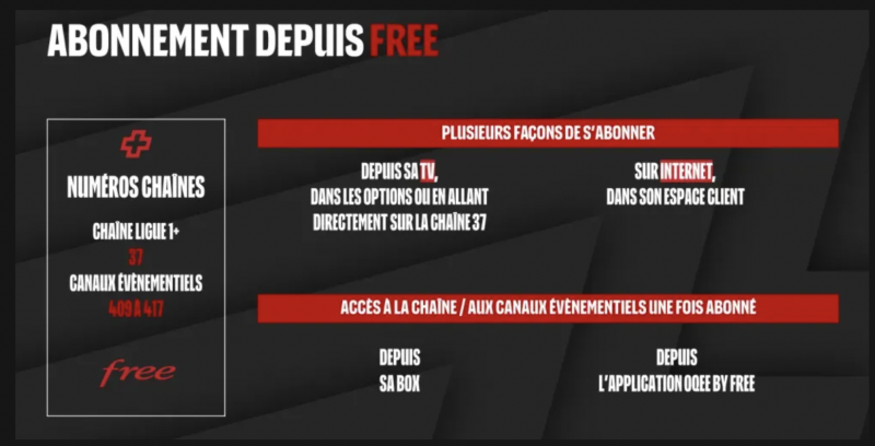 Les abonnés Free peuvent retrouver Ligue 1+ sur le canal 37, avec des canaux événementiels entre 409 et 417. L’activation se fait depuis l’interface TV en accédant aux options ou directement via la chaîne, ou depuis l’espace client en ligne. L’accès aux contenus est ensuite possible via la box ou l’application OQEE by Free.