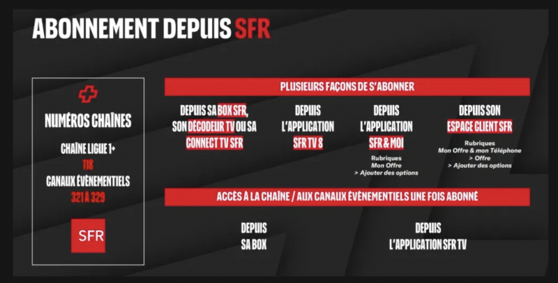Chez SFR, la chaîne principale est disponible sur le canal 118, avec des canaux événementiels allant de 321 à 329. L’abonnement peut être souscrit depuis la box, l’application SFR TV 8, l’application SFR & Moi, ou via l’espace client en ligne. Une fois activé, l’accès se fait depuis la box ou l’application SFR TV.