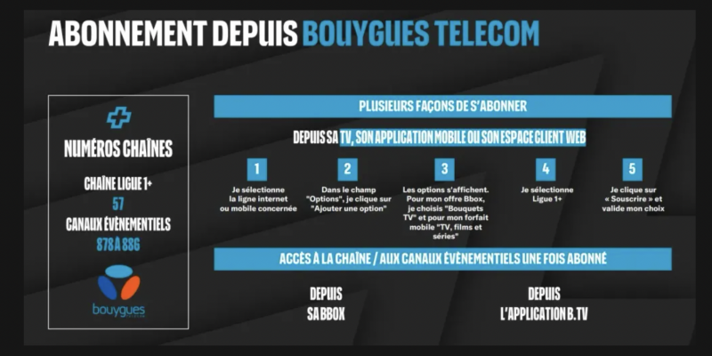Ligue 1+ est accessible sur le canal 57 chez Bouygues Telecom, les canaux événementiels étant situés entre 878 et 886. L’abonnement peut être souscrit depuis la TV, l’application B.tv ou l’espace client web, en sélectionnant la ligne concernée puis l’option Ligue 1+ dans la rubrique dédiée. L’accès est ensuite disponible via la Bbox ou l’application mobile.