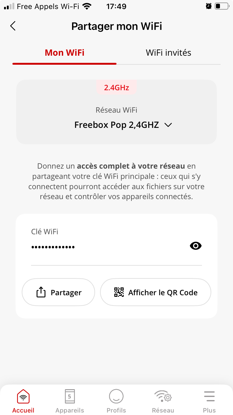 Une fois l’appli connectée à votre box, vous pouvez depuis l’écran d’accueil appuyer sur le bouton “Partager mon WiFi” et ensuite :