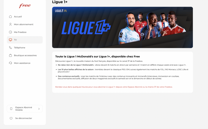 A l’heure où nous écrivons ces lignes, la souscription n’est pas encore disponible sur l’espace abonné Freebox. La rubrique dédiée est disponible mais un message indique : “Rendez-vous dans quelques heures pour vous abonner à Ligue 1+ depuis votre Espace Abonné ou la chaine 37 de votre Freebox”.