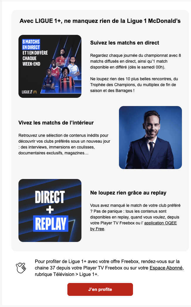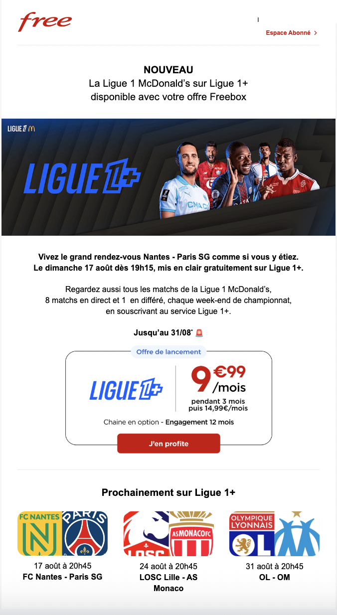 Free envoie un mail à ses abonnés Freebox pour leur annoncer une promo sur Ligue 1+, une mise en clair et l’arrivée du replay