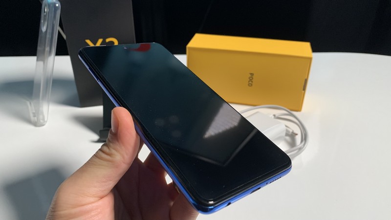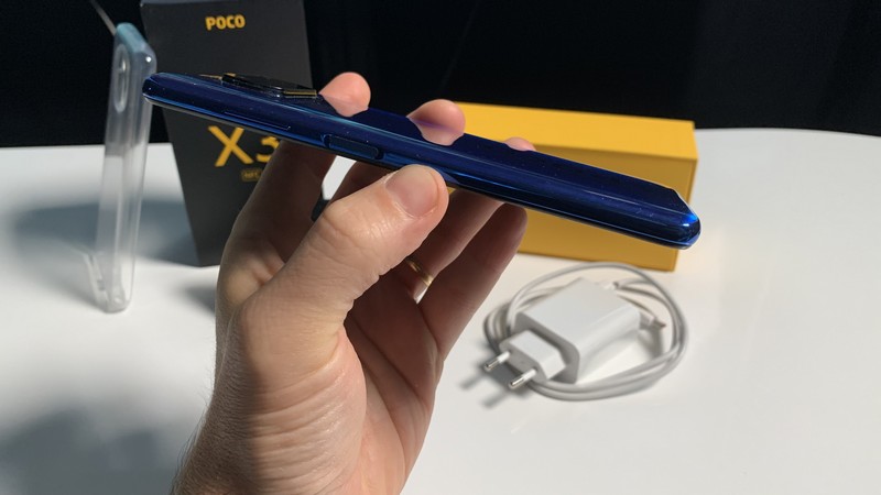 Avec son motif à trois bandes verticales et son gros logo Poco, le Poco X3 affiche clairement son identité. De face, il ne sort en revanche pas trop du lot, suivant la tendance des écrans poinçonnés.