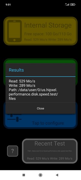 Pour les amateurs de benchmarks, AnTuTu positionnait le Poco X3 au-dessus du Redmi Note 9 Pro et d’un ancien Galaxy S9. L’outil Disk Speed indiquait pour sa part 289 Mo/s en lecture et 529 Mo/s en lecture pour la mémoire interne.