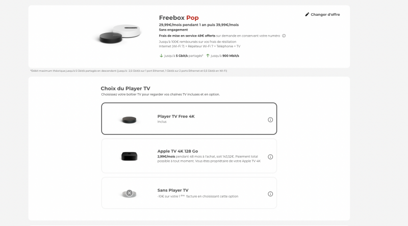 Lors d’une nouvelle souscription, seule l’offre Freebox Pop permet d’acheter l’Apple TV 4K 128 Go (Wi-Fi + Ethernet) à 2,99 €/mois pendant 48 mois, soit 143,52 € au total. Les offres Freebox Révolution Light, Pop S, Ultra Essentiel et Ultra n’incluent pas cette possibilité. L’option se choisit au moment de la souscription, et vous en êtes propriétaire une fois la totalité payée.