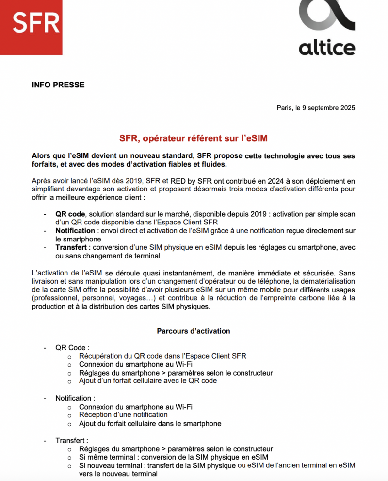 Intitulé “SFR, opérateur référent sur l’eSIM”, celui-ci rappelle que l’eSIM est présente sur tous ses forfaits tout en précisant que les parcours d’activation sont simplifiés. Les abonnés bénéficient ainsi de trois modes d’activation : QR code, notification directe sur le smartphone, ou transfert (conversion d’une SIM physique en eSIM ou migration vers un nouveau mobile). ”