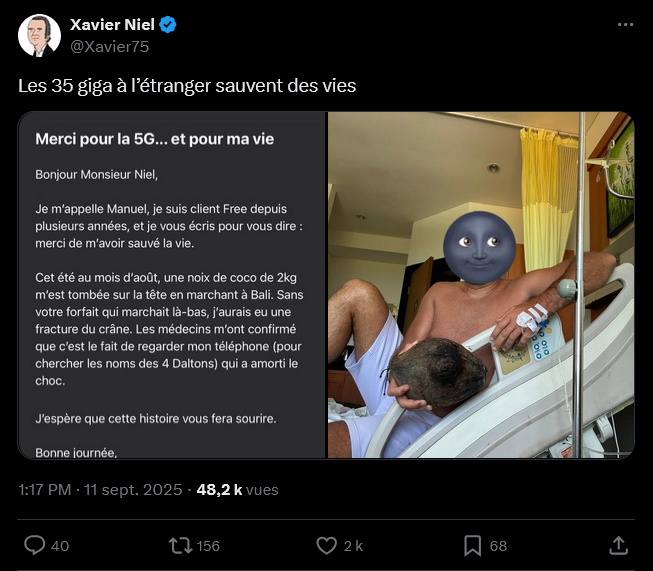Comment un forfait téléphonique peut-il éviter un accident ? Manuel explique avoir baissé la tête pour consulter son smartphone et chercher… les noms des quatre Dalton. Un geste anodin qui, selon les médecins, aurait amorti l’impact et évité une blessure grave. Dans son message, Manuel conclut avec humour : « Merci pour la 5G… et pour ma vie ». De quoi amuser Xavier Niel, qui a partagé l’anecdote sur X (ex-Twitter), en rappelant que même les 35 Go à l’étranger inclus chez Free pouvaient parfois « sauver des vies ».
