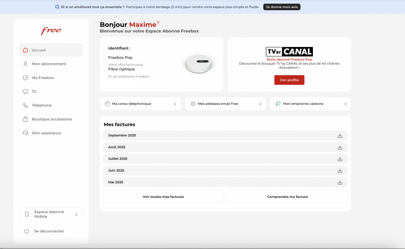 Un questionnaire express pour améliorer l’Espace Abonné et un entretien pour approfondir. Sur la page d’accueil de l’Espace Abonné Freebox, un encart invite les utilisateurs à donner leur avis : « Dans le cadre de l’amélioration de nos services, nous souhaiterions recueillir votre avis sur le fonctionnement de votre Espace Abonné Freebox… Promis, ce questionnaire ne vous prendra que 2 à 3 minutes. » Objectif affiché : identifier les usages réels, les points forts et les irritants du parcours en ligne afin d’orienter les prochaines évolutions de l’interface.