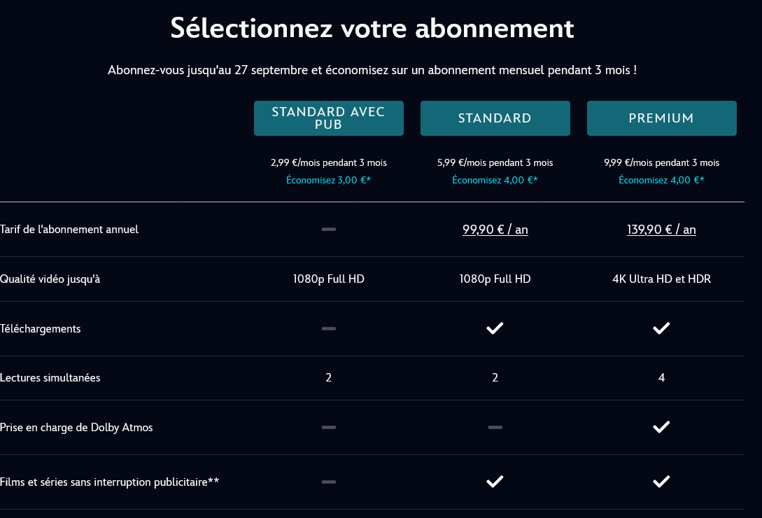 - 2,99 € par mois pour l’offre Standard avec publicité
