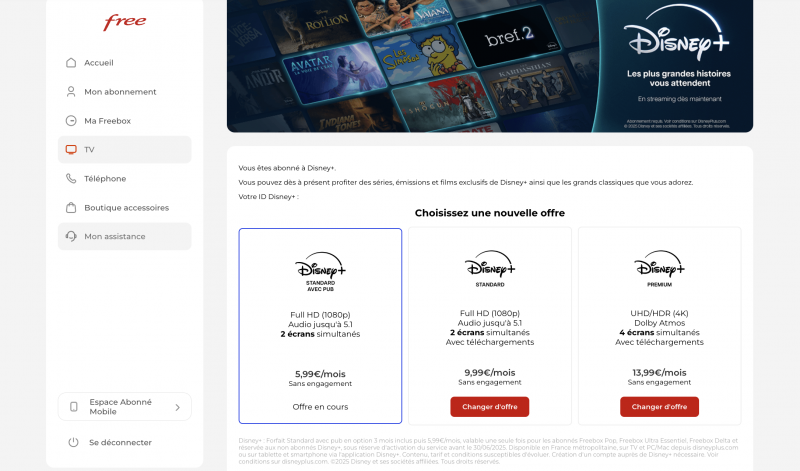 Sur la page officielle Free dédiée à Disney+, les tarifs visibles restent 5,99 €/mois (Standard avec pub), 9,99 €/mois (Standard) et 13,99 €/mois (Premium), idem sur l’espace abonné Freebox. L’offre Standard avec pub est par ailleurs incluse avec Freebox Ultra (hors Ultra Essentiel), et proposée 6 mois inclus puis 5,99 €/mois pour certains abonnés Freebox Révolution Light. Si cette hausse n’est pas encore appliquée par Free au moment où nous publions ces lignes, celle-ci devrait être effective très prochainement.