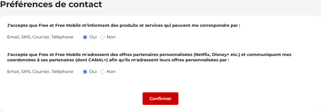 Pour les abonnés Freebox : accédez à votre espace dédié, puis à “Mon abonnement” > “Préférences de contact”. Il suffit de cocher la case qui correspond à vos besoins et de valider via le bouton rouge pour recevoir les promotions et avantages Free directement dans votre boîte mail.
