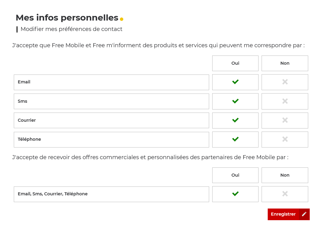 Pour les abonnés Free Mobile : rendez-vous dans la section “Mon compte”, puis cliquez sur “Mes informations” et “Mes préférences de contact”. Il est ensuite possible de sélectionner les options de contact souhaitées et de personnaliser la réception des offres (décochez la case correspondante si vous ne souhaitez pas recevoir les offres de Free par mail). Les offres partenaires, en revanche, ne peuvent pas être désactivées. Une fois vos choix effectués, cliquez sur “Enregistrer”.