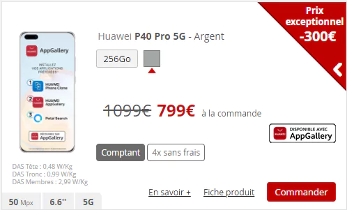 Le Huawei P40 5G quant à lui est proposé à 549€ au lieu de 799€, soit 250€ de remise. Vous pouvez également le précommander en quatre fois sans frais, moyennant 138€ à la commande puis trois fois 137€ sans frais.