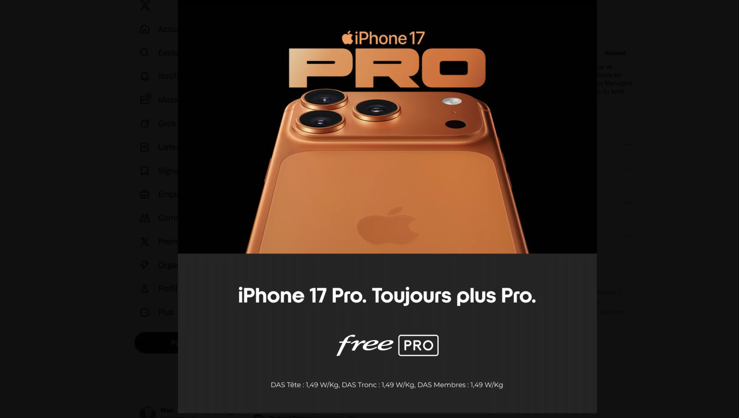 Free Pro référence désormais la gamme 2025 d’Apple dans sa boutique en ligne. Les iPhone 17 (noir et brume), 17 Pro et 17 Pro Max (Orange cosmique et bleu intense) sont proposés en achat comptant aux tarifs suivants (prix HT) : iPhone 17 à 849 €, iPhone 17 Pro à 1 159 € et iPhone 17 Pro Max à 1 289 €, chacun avec une éco-contribution de 3,07 €. Ces modèles sont disponibles en achat comptant uniquement, l’offre de location de l’opérateur n’étant pas proposée pour les smartphones de la marque à la pomme. L’iPhone Air 100% eSIM n’est pas encore commercialisé par Free Pro, son entrée dans la boutique est prévue d’ici la fin de l’année, lorsque l’opérateur lancera la carte SIM virtuelle dans ses offres.