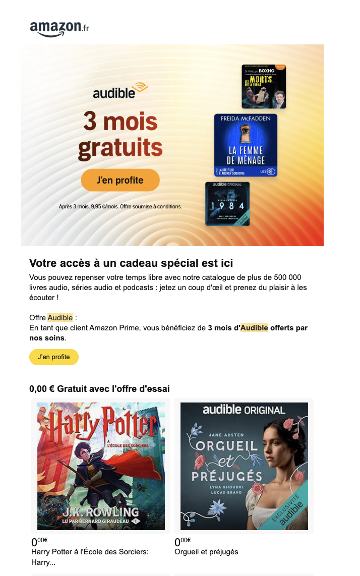 L’e-mail renvoie reçu par certains abonnés renvoie vers une page Audible annonçant  3 mois à 0,00 €, puis 9,95 €/mois au-delà, une résiliation possible à tout moment, 1 livre audio par mois à choisir dans un catalogue de plus de 500 000 titres, les livres restent par ailleurs dans votre bibliothèque même après résiliation.
