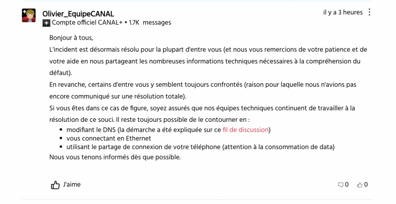 Canal+ précise toutefois que certains utilisateurs rencontrent encore des difficultés. Les équipes techniques poursuivent leurs investigations pour un retour complet à la normale. En attendant, trois solutions de contournement restent possibles : modifier le DNS de sa connexion en suivant les instructions de ce fil, passer par une connexion Ethernet ou utiliser le partage de connexion d’un smartphone (en tenant compte de la consommation de données).