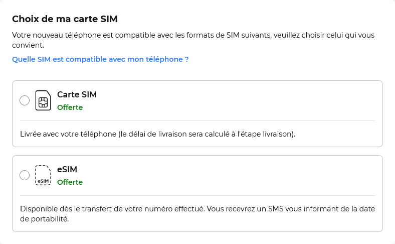 • Ancienne SIM physique : conversion gratuite et immédiate en eSIM au premier démarrage du nouvel appareil. Au démarrage du nouveau sur votre réseau Wi-Fi, un message s’affiche pour confirmer que la conversion vers l’eSIM est gratuite et immédiate.