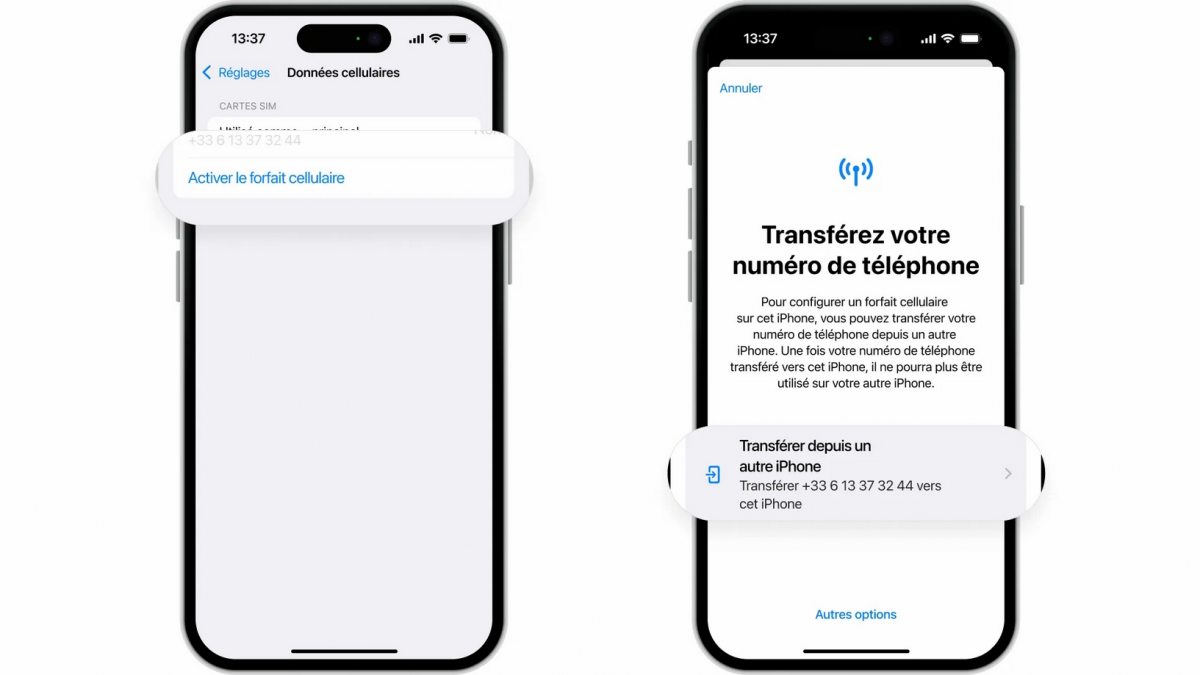 - Déjà en eSIM : transfert instantané de l’ancien iPhone vers le nouveau via Apple et sa fonctionnalité QuickTransfert.