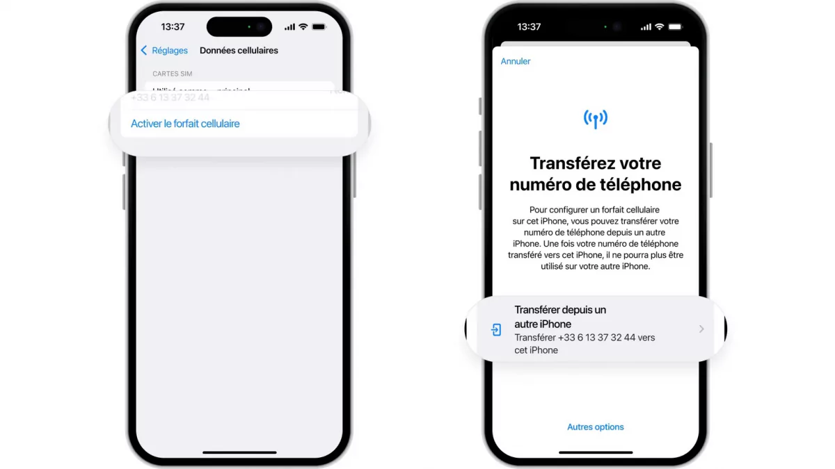• Déjà en eSIM : transfert instantané de l’ancien iPhone vers le nouveau via Apple et sa fonctionnalité QuickTransfert.