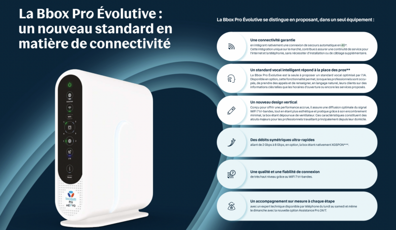 Bouygues Telecom Pro dévoile la Bbox Pro Évolutive, une nouvelle génération de box pensée pour les TPE/PME : Wi-Fi 7 tri-bandes, secours 4G intégré pour assurer la continuité d’activité, fibre XGS-PON prête pour des débits symétriques jusqu’à 8 Gb/s (en option), et un standard téléphonique pro. L’offre démarre à 49,99 € HT/mois avec accompagnement dédié. Un assistant vocal intelligent propulsé par l’IA arrivera au 1er trimestre 2026.