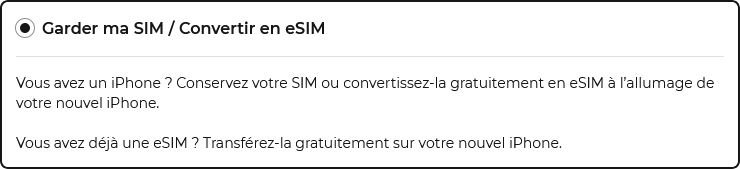 L’opérateur confirme ainsi sa volonté de simplifier la transition vers l’eSIM, devenue la norme sur les dernières générations d’iPhone. Concrètement, la gratuité s’applique désormais dans plusieurs situations, aussi bien en boutique que via l’Espace Abonné : Pour les abonnés avec carte SIM physique sur iPhone, le passage vers un nouvel iPhone compatible eSIM se fait sans frais. Au moment du premier démarrage, un message indique que la conversion SIM vers eSIM est offerte, alors qu’elle était auparavant facturée 10 €. Pour les abonnés déjà équipés d’une eSIM sur iPhone, le transfert rapide vers un nouveau modèle reste également gratuit.