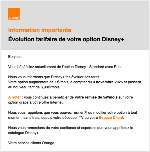 Des abonnés Livebox recoivent en ce moment un nouveau mail de la part de l’opérateur : Orange envoie ainsi un courriel intitulé “Information importante – Évolution tarifaire de votre option Disney+”. En somme, les abonnés Livebox ayant souscrit à Disney+ vont payer plus cher à partir du 3 novembre 2025. Une annonce qui n’est pas vraiment une surprise, Disney+ ayant déjà annoncé sa hausse de tarif en septembre.