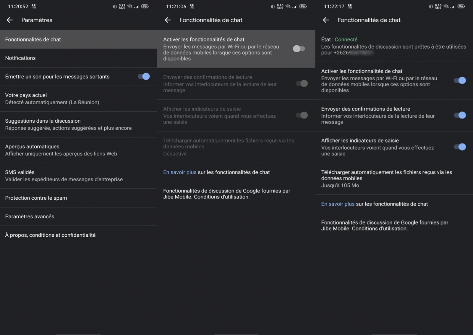 Pour profiter de ce nouveau service, il faut disposer d’un smartphone sous Android et d’installer l’application Messages de Google si cela n’est pas déjà fait. Une fois ces prérequis validés, l’application pourra vous proposer automatiquement « les fonctionnalités de chat de Google ». Si ce n’est pas le cas, il suffit de se rendre dans les Paramètres, puis Fonctionnalités de chat