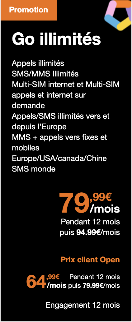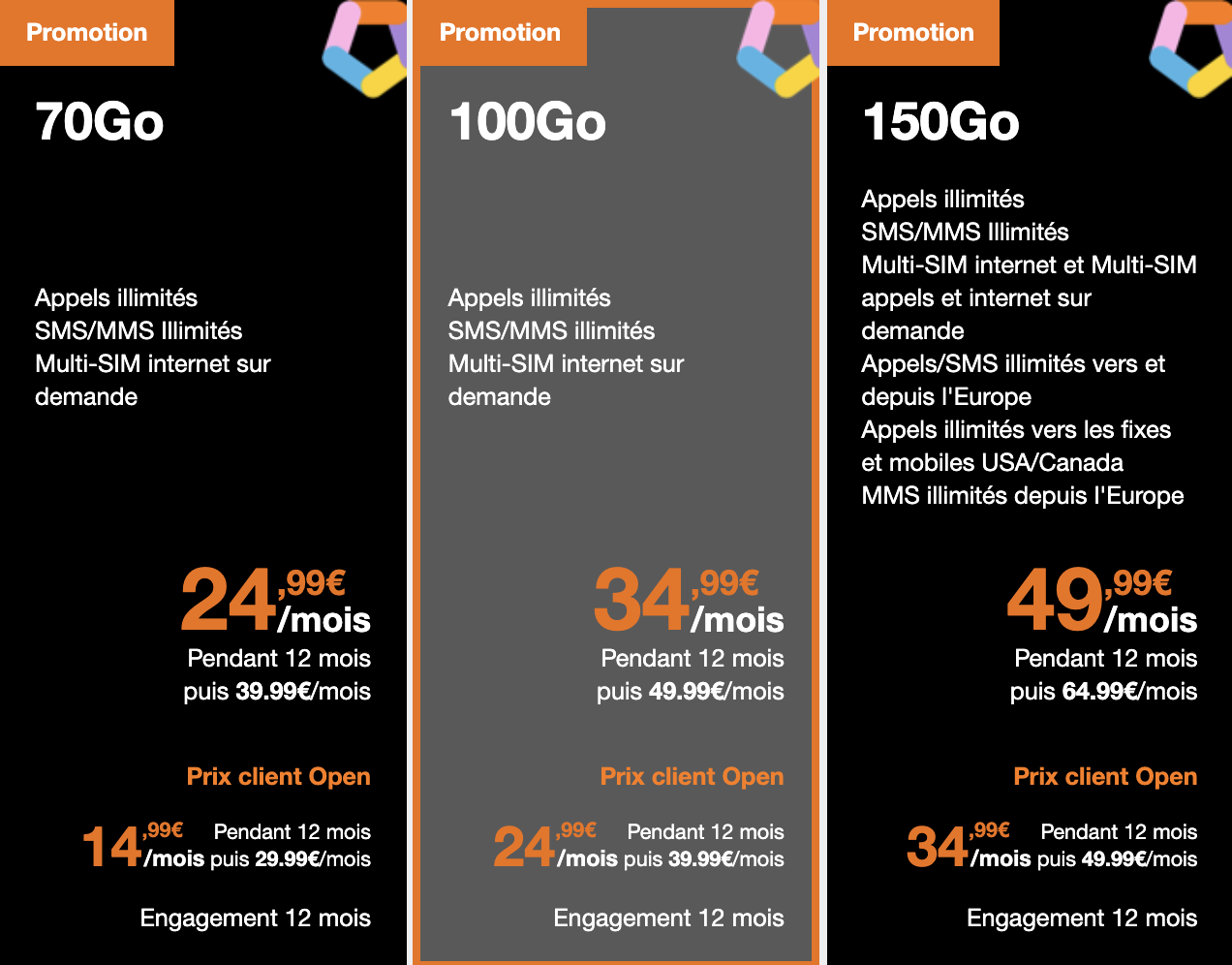 Si toutes ces nouvelles offres sont uniquement disponibles avec un engagement d’un an, elles sont bien-entendu compatibles 4G et 5G. Petit avantage, la Multi-SIM Internet est incluse dans toute la gamme, à savoir une 2ème carte SIM sur demande pour une tablette ou une Airbox. Et bonne nouvelle pour les clients Open d’Orange, les forfaits 5G, 70 Go et 100 Go leur sont proposés à un prix spécial, soit un abonnement mensuel 10€ moins cher autant la première année que par la suite. Pour le forfait 150 Go, ils débourseront 15€ de moins qu’un abonné mobile classique. La hausse reste toutefois de 5€ par rapport à un forfait 4G classique.