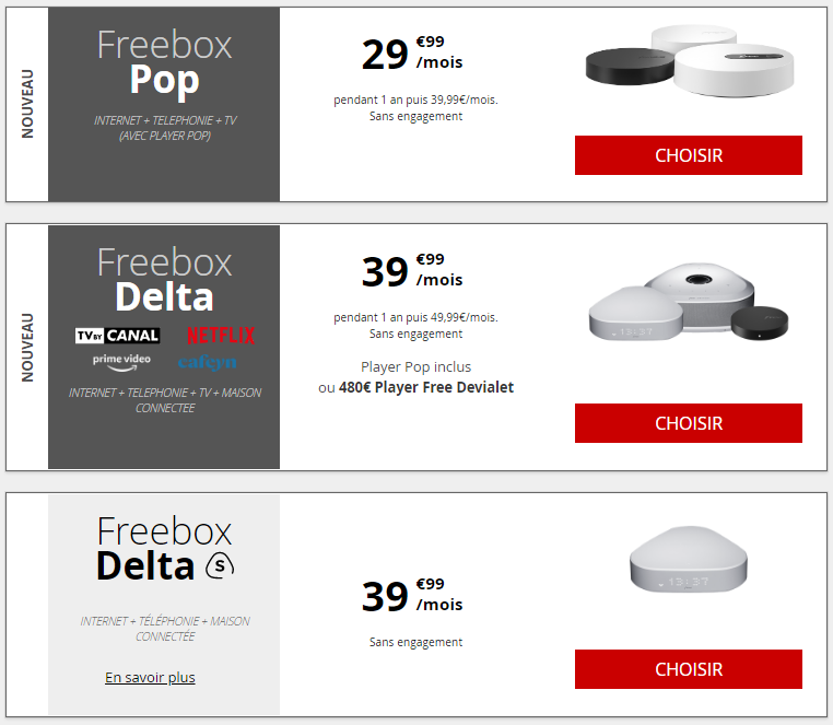 Un pas de plus a été franchi depuis quelques jours puisque la Freebox Révolution n’est plus proposée lors d’un test d’éligibilité sur le site de l’opérateur. Désormais, il n’y a plus que 3 offres disponibles : La Freebox Pop, La Freebox Delta (ou Delta Pop) et la Freebox Delta S