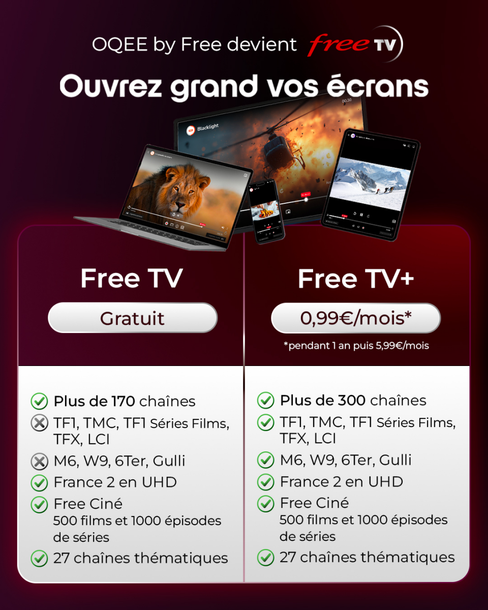 Free continue de bousculer le marché de la télévision avec le lancement de Free TV+, une offre enrichie et sans engagement, accessible à tous les Français. Disponible dès aujourd’hui, cette version premium de la nouvelle application Free TV promet une expérience enrichie par rapport à son nouveau service gratuit Free TV. Pour les abonnés Free pas de panique : le service est bien évidemment inclus. Mais les abonnés à d’autres opérateurs peuvent en profiter pou 0.99€/mois pendant un an puis 5.99€/mois, sans engagement.