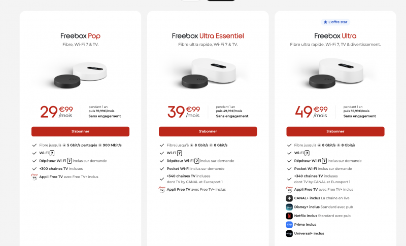 Positionnée comme l’offre la plus complète, la Freebox Ultra affiche d”sormais “+340 chaînes TV incluses”. En plus du volume, l’Ultra conserve ses atouts de divertissement avec les services premium intégrés consolidant l’écart avec les autres formules grâce à TV by Canal et les chaînes Universal+ incluses.Pour les abonnés Freebox Pop et Révolution bénéficiant justement de TV by Canal et d’Universal+ dans leur offre, le nombre de chaînes incluses est équivalent à l’Ultra.