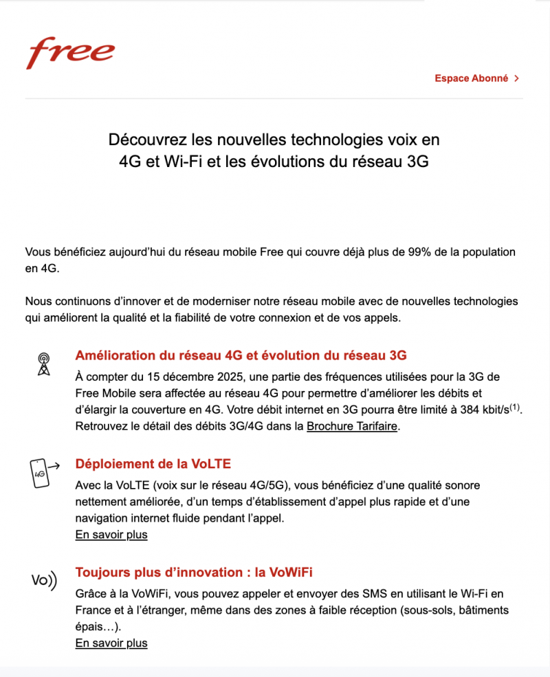 Préparer les abonnés. C’est la volonté affichée par Free dans un mail adressé ce 22 octobre. L’opérateur rappelle que son réseau 4G couvre « plus de 99 % de la population » et annonce la modernisation de son infrastructure afin d’améliorer la qualité et la fiabilité de la connexion et des appels. Free détaille deux objectifs actuels : la montée en puissance de la 4G ainsi que la généralisation des appels 4G (VoLTE) et des appels Wi-Fi (VoWiFi).