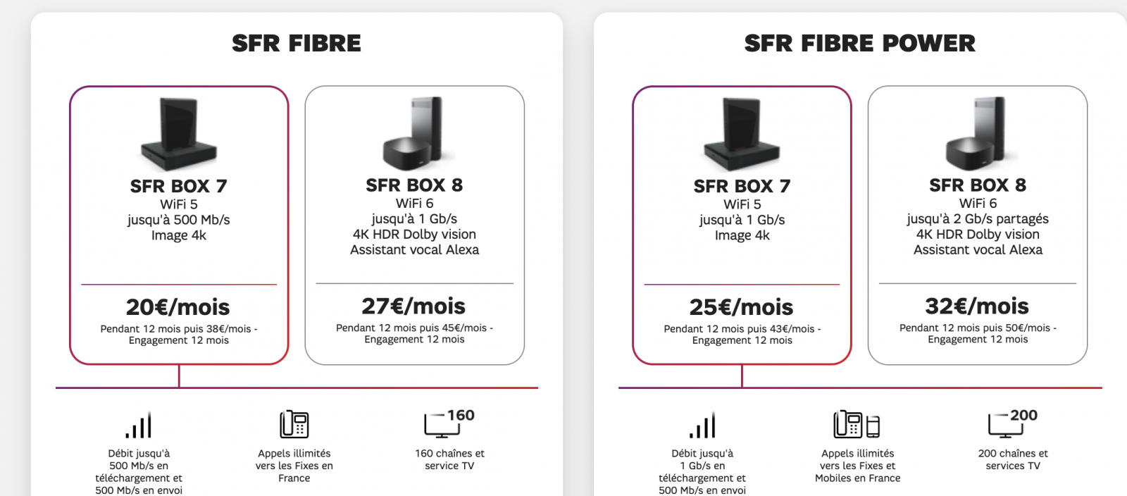 La première, “SFR box 8” est facturée 27€/mois pendant un an puis 40€/mois en ADSL et 45€/mois en fibre ou en câble. La seconde baptisée “SFR Power box 8” devient l’abonnement le plus haut de gamme, lequel est proposé au tarif de 32€/mois la première année, puis 45€/mois en ADSL et 50€/mois en FTTH ou FTTB. Le différentiel reste le même qu’auparavant en matière de prix avec les offres classiques SFR box et Power comprenant quant à elles un player de génération précédente et moins de débit fibre par exemple.