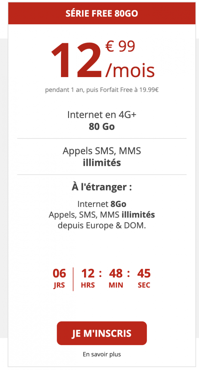 Disponible jusqu’au 20 octobre prochain, cette offre comprend ainsi 80 Go dans l’hexagone et 8 Go en roaming sans oublier les appels, SMS et MMS en illimité. Au-delà de la première année, les abonnés basculeront automatiquement sur le Forfait Free avec enveloppe data de 100 Go à 19,99 euros par mois ou avec data illimitée à 15,99 euros par mois pour les abonnés Freebox.