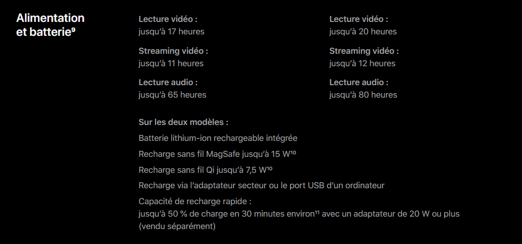 L’iPhone 12 Pro le talonne de près, mais n’offre que jusqu’à 65 heures de lecture audio. Pour la recharge, Apple propose une recharge rapide permettant d’effectuer une charge de 50 % en plus ou moins 30 min grâce à un adaptateur de 20 W ou plus. La recharge sans fil Qi jusqu’à 7,5 W est également possible. Grâce à la technologie MagSafe, la recharge sans fil sera plus rapide, car il monte jusqu’à 15 W et offre une compatibilité avec les accessoires aimantés.