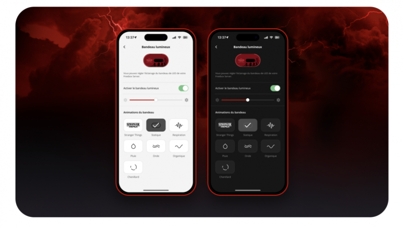 Plus concrètement, les équipes Free ont personnalisé le Server Internet de la Freebox Ultra en y intégrant l’univers emblématique de la série. Ainsi le serveur arbore une parure exclusive inspirée de l’univers rétro et fantastique de la série avec bandeau lumineux LED inspiré des fameuses guirlandes de la série, avec 7 modes d’animation personnalisables via l’application Freebox Connect. “À l’allumage, les silhouettes des quatre héros principaux, poursuivis par le Démogorgon, apparaissent sur l’écran d’affichage du Server”, explique Free.