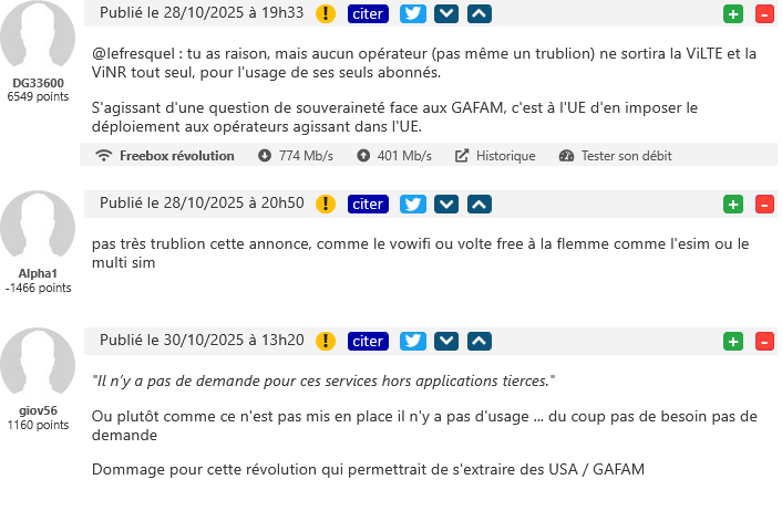 La visiophonie « native » ViLTE/ViNR a-t-elle une chance de voir le jour chez Free Mobile à l’heure où les abonnés n’ont pas d’autres choix que de passer des appels vidéo via des apps tierces comme Whatsapp ? La réponse de Free est sans équivoque : « Le déploiement de cette technologie n’est pas prévu pour le moment. Il n’y a pas de demande pour ces services hors applications tierces. De plus, il faudrait que les autres opérateurs déploient cette technologie pour que le service soit réellement utilisable par tout le monde. » Une annonce qui a plutôt déçu.