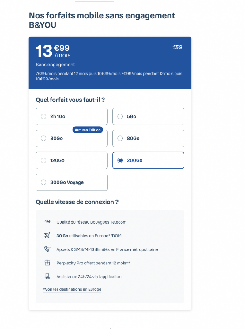 En consultant le site de Bouygues Telecom, le même abonné découvre qu’un forfait B&You 200 Go 5G est proposé à 13,99 €/mois, soit 4€ de moins sans condition d’ancienneté apparente. Mais en tentant de migrer vers cette formule, le tarif affiché grimpe à 20,99 €, car l’offre à 13,99 € est réservée aux nouveaux clients ouvrant une nouvelle ligne. Moins onéreuse, cette offre intègre même 30 Go en roaming mais l’assistance est uniquement disponible via l’application. En plus, Perplexity Pro est d’ailleurs offert pendant 1 an.